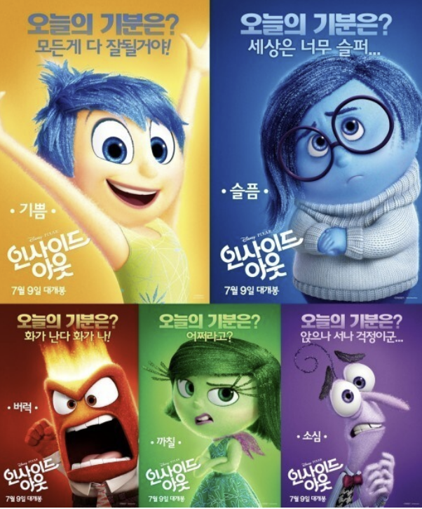 <인사이드 아웃>은 2015년에 개봉한 애니메이션 영화로, 피트 닥터 감독의 작품이다. 사람의 감정을 캐릭터화하여 표현한 스토리로 감정과 마주할 수 있는 경험을 할 수 있다. 영화는 라일리라는 소녀의 머릿속에서 벌어지는 여정을 보여준다. 주인공인 라일리의 다양한 감정들과 그들이 상징하는 캐릭터들의 감동적인 스토리를 통해 성장과 각 감정의 복잡성을 다룬다.